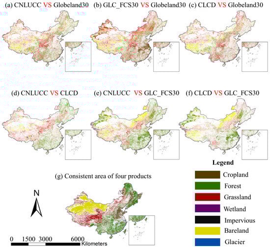 The spatial pattern among four land cover products at 30m spatial resolution in 2020. (a–f) The inconsistent pixels between each two land cover products; (g) the consistent pixels of four land cover products.