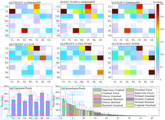 Pixel ratio-based confusion matrix of land cover types between land cover products (a–f). (g) Proportion of the consistent land cover for four land cover products; (h) proportion of land cover inconsistencies between four land cover products. Proportions in (g,h) are calculated based on average area of land cover type or land cover combination area in four products. CL: cropland, FL: forest, GL: grassland, WL: wetland, IS: impervious, BL: bareland, GS: glaciers.