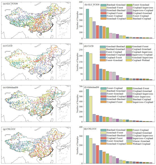 (a,c,e,g) The spatial pattern of the misclassification sample of land cover products; (b,d,f,h) the number of samples ranked in descending order of quantity. The legends only show the top 12 types of misclassification in terms of sample size.
