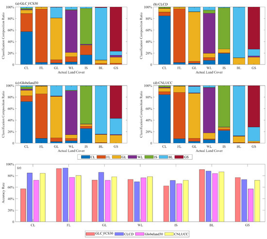 (a–d) The confusion proportions, a key factor in understanding the classification accuracy, for each of the land cover types in the validation dataset; (e) classification accuracy of land cover types in products. CL: cropland, FL: forest, GL: grassland, WL: wetland, IS: impervious, BL: bareland, GS: glaciers.