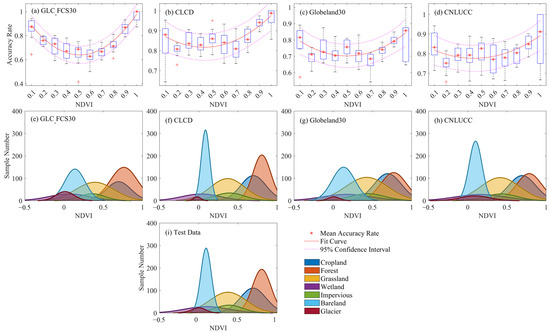 (a–d) The relationship between classification accuracy and NDVI; (e–i) the probability density distribution of NDVI for land cover types in each land cover product and validation dataset.