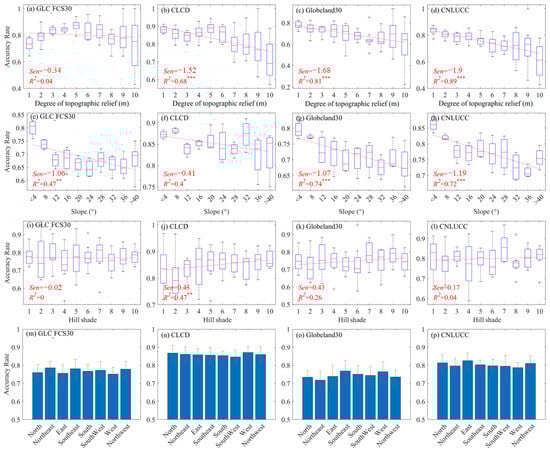 Using the gradient analysis mentioned earlier, we can determine the classification accuracy within different impact factor intervals. Further analysis through correlation and regression helps us thoroughly evaluate the relationship and sensitivity of classification accuracy to these factors. When the classification accuracy exhibits a linear change with the gradient of the impact factor, we used the linear regression method to assess the correlation and sensitivity of classification accuracy to impact factors. The regression of spatial variation of classification accuracy with impact factors can be expressed as follows: