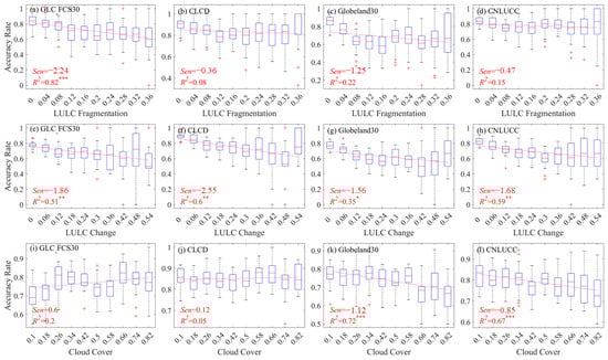 Cloud cover can significantly impact land cover classification accuracy by masking the Earth’s surface, resulting in incomplete or distorted images [63]. This degradation in data quality compromises the reliability of spectral signatures crucial for distinguishing various land cover types. Consequently, regions characterized by frequent or dense cloud cover are prone to higher misclassification rates in land cover products. We extracted the cloud mask from the Landsat 8 images from 2018 to 2022, including cloud cover and shadow [64]. Then, we calculated the annual mean cloud mask for each validation point.