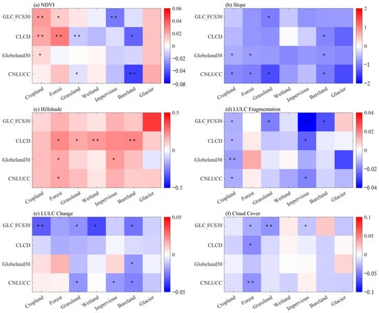 Based on stratified random sampling, there are substantial differences in identification accuracy across different products (see Table 3). CLCD holds a distinct advantage in identifying cropland, forests, grasslands, and impervious surfaces, though its performance in wetlands is much weaker than other products (see Figure 7b,e). CNLUCC shows good accuracy in recognizing impervious layers and cropland, and it outperforms other land cover products in wetland identification. However, its accuracy in forests is lower than that of other products, and it is prone to misclassifying forests as grassland or cropland. The GLC_FCS30 accurately identifies bareland and glaciers, outperforming other land cover products. However, its accuracy in identifying cropland and impervious surfaces could be improved, as many forests are misclassified as cropland or grassland. Although Globeland30 excels in wetland identification, it exhibits lower accuracy in other land cover types, particularly glaciers, where its accuracy is significantly below that of different products (see Figure 7c,e).
