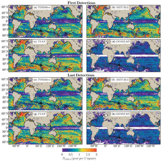 Frequency maps of first (a–d) and last (e–h) detection points of mesoscale eddies per year derived from TOEddies, META3.2, TIAN, and GOMEAD datasets, respectively. The data are aggregated into bins and normalized by the number of observation years for each dataset. The mean dynamic topography (MDT; in cm) is shown by black contours.