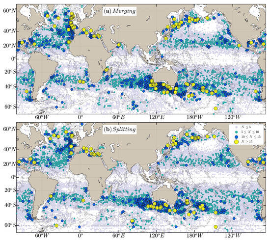 Figure 2 shows frequency maps of eddy–eddy interactions (merging and splitting events) identified by TOEddies. It is important to note that the spatial distribution of merging and splitting events, as identified by TOEddies, also occurs in similar locations. This reinforces the necessity of considering eddy–eddy interactions for comprehensive understanding of the detected eddies’ dynamic evolution. Over the course of the observation period, approximately 3% of the detected eddies were found to be involved in merging and splitting events, with 52% of these classified as cyclonic eddies.