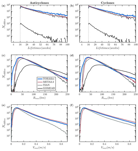 Histograms of eddy lifetimes (weeks) (a,b) and histograms of eddy characteristic radius (km) (c,d) and velocity (m/s) (e,f) of anticyclonic (first column) and cyclonic eddies (second column) for the TOEddies, META3.2, TIAN, and GOMEAD datasets. We consider only mesoscale eddies having lifetimes ≥ 16 weeks, as indicated by the dashed lines in panels (a–d), and characteristic radii larger than 30 km.