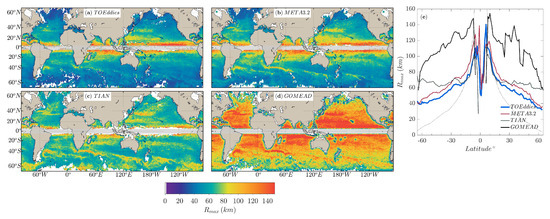 To identify areas where these differences are noticeable, in Figure 4 we present the geographical distribution of the radii of eddies. These maps were calculated by averaging the for each daily detected mesoscale eddy that falls within bins of . For a suitable comparison, zonal averages of the eddy radius are also computed in Figure 4e. In terms of the spatial radius distribution, smaller eddies are detected near the poles and larger ones near the equator. This aligns with the first baroclinic Rossby radius, which varies with latitude [10,54]. However, the absolute values of the eddy radius vary considerably across the datasets. The mean zonal radii from the GOMEAD dataset are higher, estimated at approximately ~150 km in the equatorial bandwidth of S to N. In contrast, the TOEddies, META3.2, and TIAN datasets detect lower eddy radii of the order of 100–120 km. At latitudes lower than S and higher than N, the TIAN dataset identifies larger structures of approximately 60 km, while the TOEddies and META3.2 estimates indicate smaller structures (~40 km).