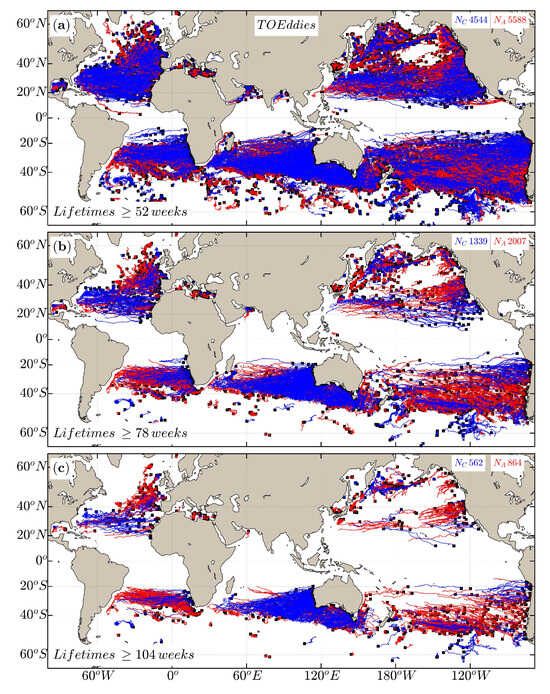 Cyclonic (blue) and anticyclonic (red) eddy trajectories as detected from the TOEddies algorithm having lifetimes of at least (a) ≥52 weeks, (b) ≥78 weeks, and (c) ≥104 weeks. The numbers of detected eddies are labeled at the top of each panel for each polarity.