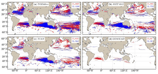 Trajectories of long-lived (≥78 weeks) cyclonic (blue) and anticyclonic (red) eddies from the (a) TOEddies, (b) META3.2, (c) TIAN, and (d) GOMEAD datasets. The numbers of eddies are labeled at the top of each panel for each polarity.