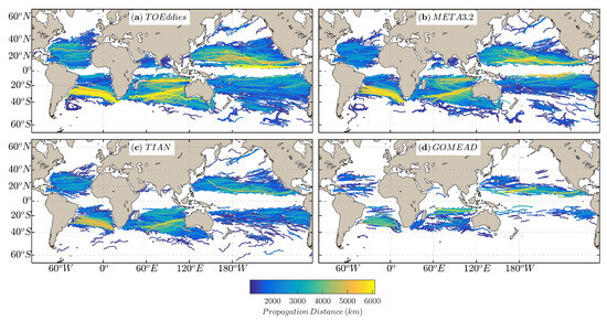 It is also worth noting that there are differences in the behavior of long-distance propagating eddies between the eddy datasets. Figure 7 illustrates the trajectories of eddies from each dataset that were tracked for over 26 weeks and propagated over 1100 km. The distance was calculated for each eddy trajectory as the centroid distance between their initial and final positions, measured in kilometers. Long-lived, far-propagating eddies are of considerable interest to many studies due to their significant role in trapping and transporting water masses, along with heat, carbon, and oxygen. This process, in turn, influences global climate, marine connectivity, and ecosystem functioning [4,7,40,57]. The reliability of such estimates hinges on the precision with which mesoscale eddy temporal evolution and their en route interactions can be characterized. For example, the long-propagating Agulhas Rings leave a visible surface signature in the South Atlantic, which is reflected in all datasets. However, there are slight differences in the overview of the main eddy pathways depicted in each atlas, with some cases showing significant discrepancies. Such examples are visible mostly in the Pacific Ocean, where TOEddies detects more long-propagating eddies in the North Pacific, while only a portion of them is found in the TIAN dataset and META3.2 dataset (~11% and 46% fewer long-propagating trajectories, respectively). Large variations can also be observed in the South Pacific and North Atlantic.