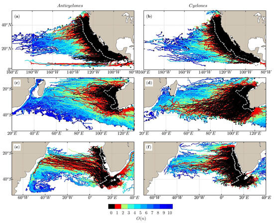 Eddy-network example of anticyclonic (first column) and cyclonic (second column) trajectories for the (a,b) California Upwelling System, (c,d) western Australian boundary, and (e,f) extended South Benguela System. Each eddy trajectory is colored according to its assigned order.