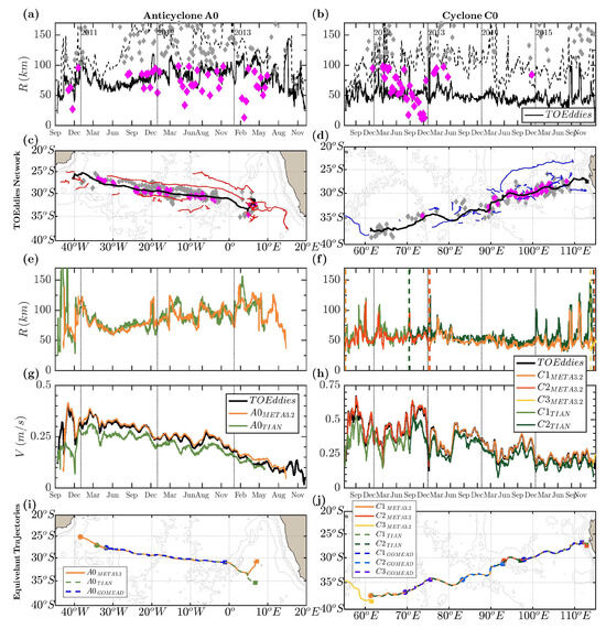 Temporal evolution of dynamical characteristics of anticyclone A0 and cyclone C0, as tracked by all considered datasets. The evolution of the eddy characteristic radius (km) and outermost radius (km) as tracked by TOEddies is shown in panel (a,b) for A0 and C0, respectively in black. The TOEddies network reconstruction composed of all detected trajectories, anticyclonic (red) and cyclonic (blue, that have merged and splitted with the main trajectories is shown in panels (c,d). The evolutions of the eddy radii and characteristic velocity (m/s) from the different datasets are shown in panels (e–h). Panels (i,j) depict the equivalent A0 and C0 trajectories as tracked from the META3.2, TIAN, and GOMEAD datasets. Bathymetric contours at −500 m, −1000 m, −2000 m, and −4000 m are indicated by gray lines.