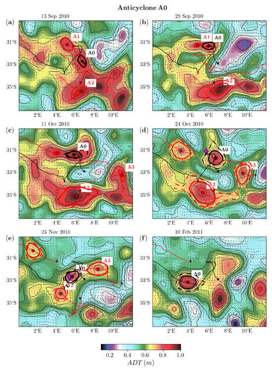 Snapshots along the temporal evolution of anticyclone A0 (panels a–f) propagating westward in the Southern Ocean. The background colors correspond to the ADT (m) fields while the gray arrows correspond to surface geostrophic velocities. The characteristic and outer contours as detected by TOEddies are shown in the black solid and dashed lines. The Argo floats trapped in the eddies are shown with the magenta diamond points.