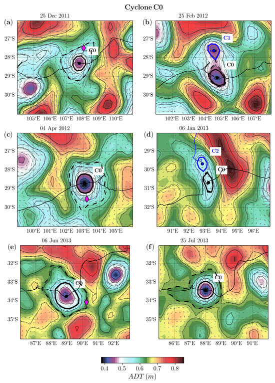 Snapshots along the temporal evolution of cyclone C0 (panels a–f) propagating westward in the Indian Ocean. The background colors correspond to the ADT (m) fields while the gray arrows correspond to surface geostrophic velocities. The characteristic and outer contours as detected by TOEddies are shown in the black solid and dashed lines. The Argo floats trapped in the eddies are shown with magenta diamond points.