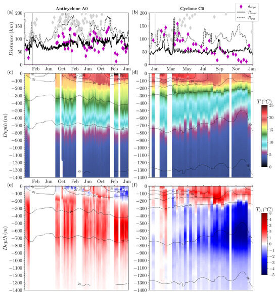 Temporal evolution of anticyclone A0 and cyclone C0 vertical structures as obtained by Argo floats trapped inside the eddy core () (shown as magenta points in panels (a,b). Vertical profiles of temperature and temperature anomalies are shown in panels (c,e) for anticyclone A0, and in panels (d,f) for cyclone C0.
