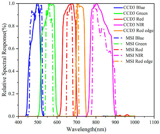 In this study, the blue, green, red, NIR, and red edge, corresponding to the bands of CCD3 and the MSI, are selected for the research on cross-calibration. Table 1 lists the wavelength range, spatial resolution, swath width, and revisit cycle of the corresponding bands of the CCD3 and MSI sensors, and Figure 1 demonstrates the RSRs of the two sensors in the five bands.