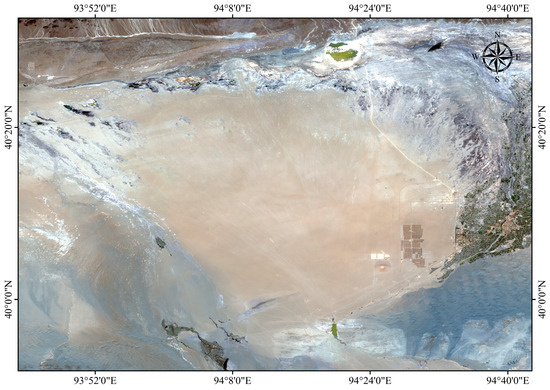 The Dunhuang radiometric calibration site (DRCS) is a radiation calibration site in China, situated in the Dunhuang area of Jiuquan City, Gansu Province. The whole site spans approximately 30 km by 30 km, located between the geographic coordinates of 40.04°N to 40.28°N and 94.17°E to 94.50°E (as illustrated in Figure 2), with an elevation of around 1200 m above sea level [32,33]. As a national radiation calibration field, it has been internationally recognized by the virtue of its uniform and flat ground surface, wide range, low precipitation, small atmospheric fluctuations, etc., and is often used to carry out research on site calibration experiments [34]. It is also a radiation transmission platform for evaluating the difference in radiation between two kinds of sensors [35]. Therefore, the DRCS is used as a calibration site in this study.