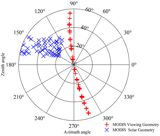 As there is an angle difference between the two sensors, BRDF correction needs to be considered. This is why a total of 70 MODIS images in 2022 transiting the DRCS are collected to extract angle and reflectance information, and no cloud occlusion is allowed. The extracted reflectance values should have a CV of less than 3% to ensure feature homogeneity, while outliers are rejected with the condition of mean ± two times the SDs [17,41]. The solar/viewing geometry information is extracted from the MOD03 product, and the geometry information is shown in Figure 4.