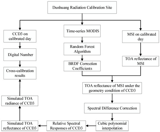 In this study, the random forest algorithm and a spectral interpolation convolution method are proposed for the cross-calibration of HJ-2A/CCD3 using Sentinel-2/MSI with high radiometric performance as a reference sensor. A flowchart of this method is shown in Figure 5.