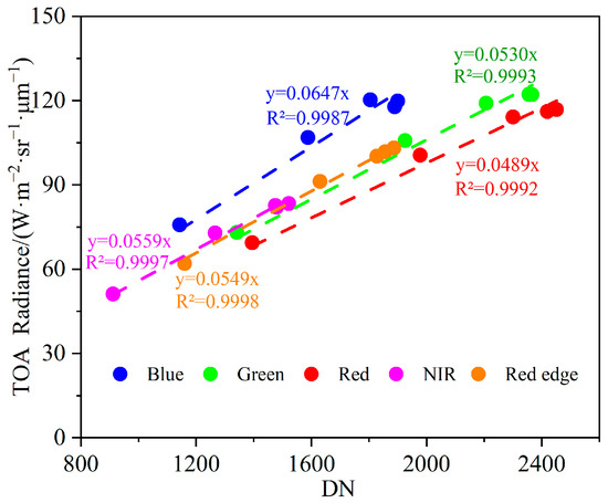 Generally, radiometric calibration can be categorized into two broad types: absolute radiometric calibration and relative radiometric calibration [4,5]. Relative radiometric calibration is the process of correcting for differences in the relative response of the imaging elements of a sensor [6]. Absolute radiometric calibration establishes a quantitative relationship between the digital number (DN) of the image and the amount of radiation [7]. Absolute radiometric calibration has an important impact on the improvement in remote sensing image quality and applications [8,9], ensuring the reliability of image data and meeting the needs of quantitative applications [3].