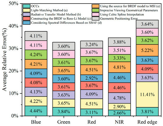 In this study, the measured TOA reflectance (*.output) of the Baotou sandy site is first interpolated to 1 nm intervals and then convolved with the RSRs of CCD3, eventually taking the interpolated and convolved reflectances (ICRs) as the true value. Subsequently, the FCCs along with the OCCs are converted to reflectance and then compared to ICRs to determine the relative errors of the two validation images. Relative error is defined as the absolute value of “reflectance calculated based on FCCs/ICRs − 1” and the absolute value of “reflectance calculated based on OCCs/ICRs − 1”, respectively [19,21]. Then, the average relative error of the two validation images is also calculated, and the results are shown in Figure 7.