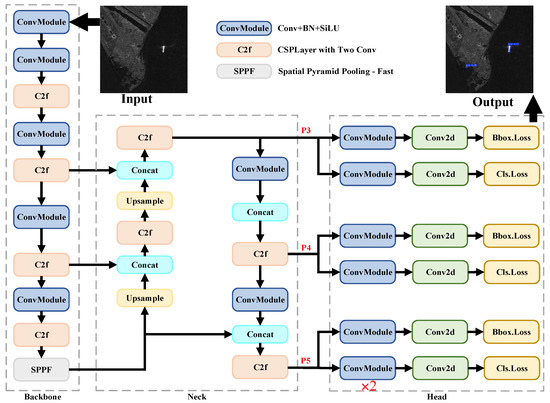 The architecture is illustrated in Figure 1. At the start of inference, the input features are first fed into the backbone to extract features. After finishing extraction in the backbone, the extracted feature maps are subsequently processed by the neck, which generates three levels of the scale-specific feature maps using the PANet architecture [34], being primarily composed of modules C2f, Bottleneck, and upsample. Finally, the head uses three decoupled heads for the final detection output.