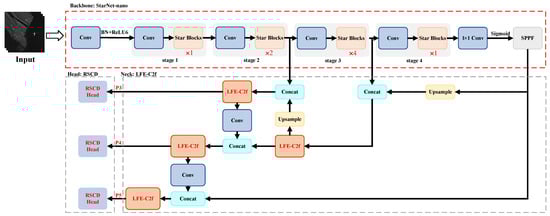 As shown in Figure 2, a new network architecture has been proposed. We designed an SAR ship detection model named LH-YOLO, which is based on the YOLOv8n. Three major improvements were incorporated in the LH-YOLO. First, a newly designed StarNet-nano backbone was incorporated in the backbone network of the LH-YOLO, which was constructed based on the next-generation SOTA lightweight model, known as StarNet [38]. We established a lightweight four-stage backbone, significantly reducing parameter count and computational load while maintaining performance. Second, we enhanced the core module in the neck network, the C2f module, by developing the LFE-C2f module, which reduces parameters and improves feature representation capabilities through element-wise multiplication that maps features into a high-dimensional implicit feature space. Third, we designed the RSCD head. By employing a weight-sharing mechanism, RSCD’s required convolutional layers are decreased, decreasing the parameter count of the detection head. Additionally, the reuse of parameters addresses the limitation of low-parameter utilization in the head network.