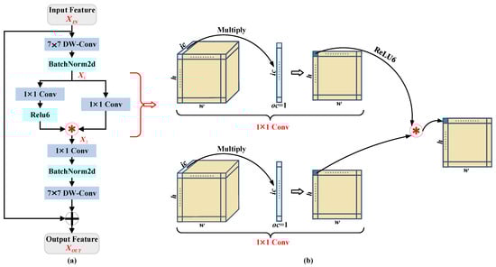 where represents the fully connected layer, represents the depthwise convolution operations with a kernel size of , and means batch normalization. ⨁ represents the elementwise addition between the two feature matrices, and ∗ means the elementwise multiplication.