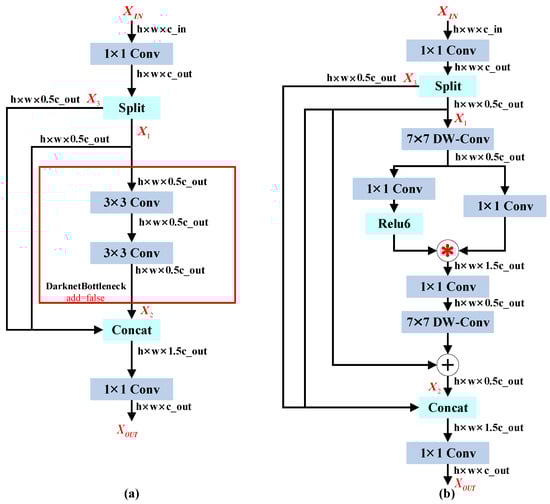 The C2f module structure in YOLOv8n’s neck is illustrated in Figure 4a. First, the input features undergo a transformation through a convolutional layer, improving the expressiveness of the feature of the model. The resulting output is then split into two parts based on the output channels. One part is sent directly to the output, while the other part is processed by a DarknetBottleneck module to extract deeper features. This C2f module in the neck section does not include shortcut connections. The results of these two parts are concatenated along the dimension of the output channel to enhance the diversity of characteristics. The concatenated feature maps are then compressed by a second convolutional layer. The required output channels are then obtained for subsequent processing. The specific process can be described as follows.