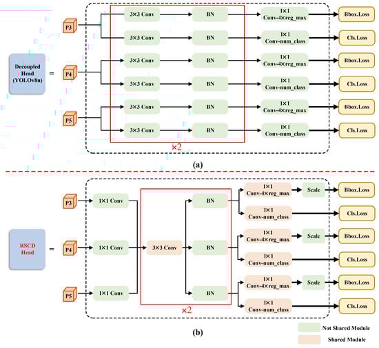 (a) The framework of the decoupled head of YOLOv8n. (b) The framework of the RSCD head.
