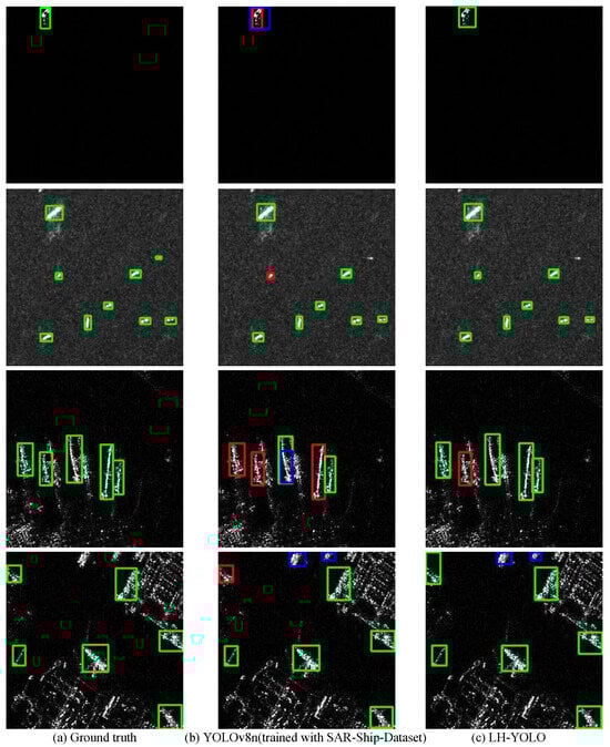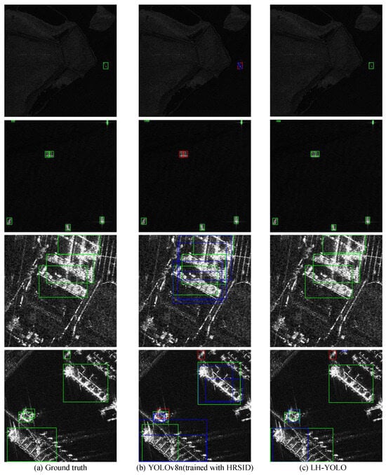 We carried out in-depth experiments on both the HRSID and SAR-Ship-Dataset to offer a more thorough evaluation of LH-YOLO’s performance. These experiments aimed to demonstrate the superior effectiveness of our LH-YOLO model for ship detection tasks. The evaluation included single-stage algorithms such as YOLOv3-Tiny [18], YOLOv5, YOLOv8n, and YOLOv10n [17], as well as two-stage algorithms such as Faster R-CNN, Cascade R-CNN, and Mask R-CNN, as shown in Table 3. We have also included comparisons with the latest lightweight models, such as ESarDet [47], Improved YOLOx-Tiny [48], YOLO-Lite [49], and SHIP-YOLO [50]. In the final row, LH-YOLO represents our proposed model. To ensure a fair comparison, we maintained consistent parameter settings across the various networks during training. This approach facilitated a clearer understanding of the advantages and effectiveness of LH-YOLO in ship detection tasks.