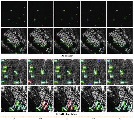 Detection results comparison using the HRSID dataset. Green boxes represent ships that have been correctly detected, while blue boxes indicate incorrectly detected ships. Additionally, red boxes denote ships that were not detected at all.