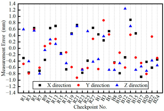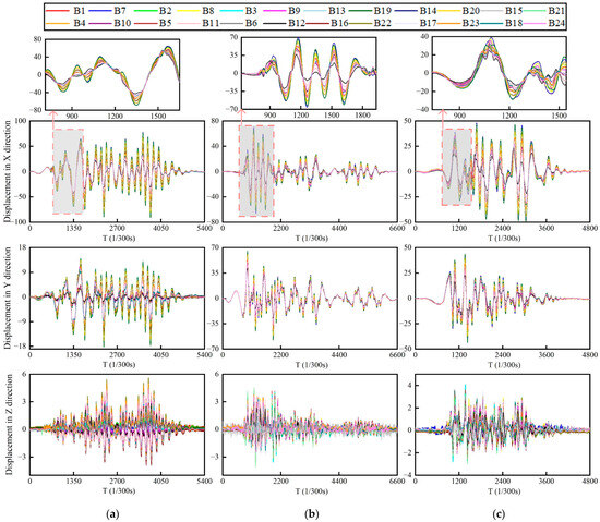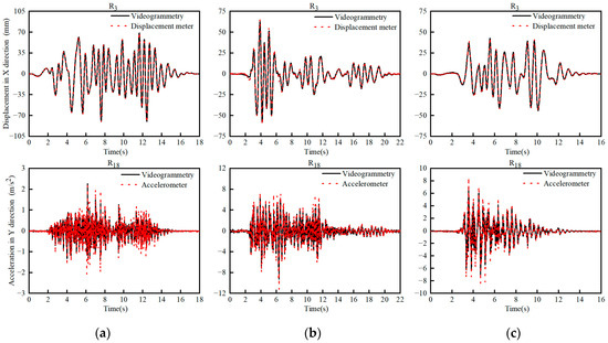 - The 3D displacement responses of all points of interest on a large structure with RCBs (1.8 m in length, 1.3 m in width, and 6.3 m in height) were measured using the proposed videogrammetric method in real time. The RMSE of the proposed method in the X, Y, and Z directions was 0.57 mm, 0.64 mm, and 0.52 mm, respectively, compared to the measurements of high-precision total stations. The RMSE of displacement responses in a single direction was approximately 0.96 mm compared to the contact displacement sensor, and the acceleration response range and trend were consistent with accelerometer measurements.