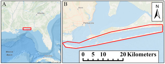 (A). The location of Pensacola Bay is indicated by the red box. (B). The location of Santa Rosa Sound is indicated by the red outline. Underlying Ocean basemap from Esri.ArcGIS Pro 3.3.2. Sources: Esri.Arc, GEBCO, NOAA, National Geographic, DeLorme, HERE, Geonames.org, and other contributors.