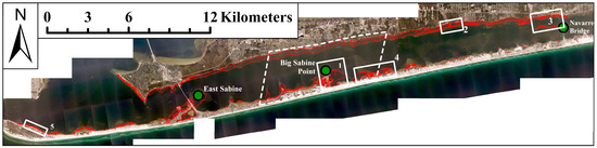 Aerial imagery with areas identified as containing seagrass overlaid as polygons (red). The white-dashed box is the location of image overlap used in uncertainty estimates; solid white boxes numbered 1 through 5 are the locations of examples shown later figures. Green dots highlight the locations of East Sabine and Big Sabine Point, mentioned later in the text.