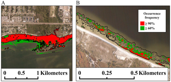 An occurrence frequency (OF) map was generated by calculating the percentage with which each pixel was identified as seagrass throughout all 10 available images (Figure 2), as follows: