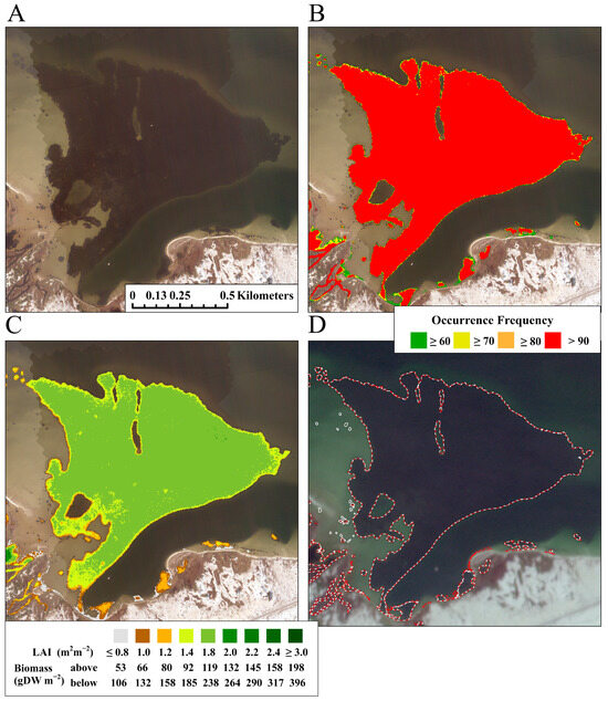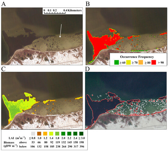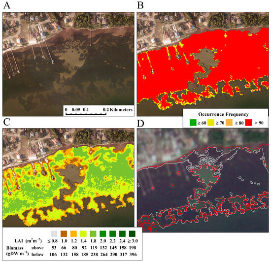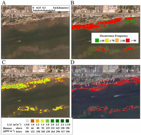 (A) RGB representation of a subset of aerial imagery showing the large continuous seagrass meadow at Big Sabine Point in the middle of Santa Rosa Sound (see Figure 3, box 1). (B) Seagrass OF derived from all satellite images overlaid on the aerial imagery from panel (A). (C) Mean leaf area index, above-ground biomass, and below-ground biomass overlaid on the aerial imagery from panel (A). (D) Polygons based on aerial imagery (dashed white lines) and polygons generated for OF ≥ 60% (dashed red lines) overlaid on Planet imagery.