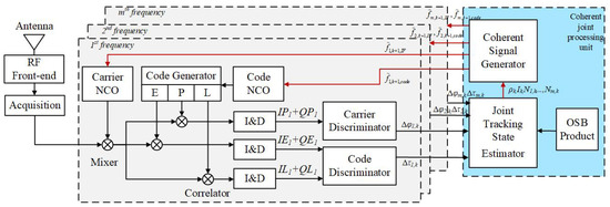 Studies on joint signal tracking through multifrequency can be categorized into two groups: inter-band aiding and joint carrier tracking. The inter-band aiding method uses a linear combination of different frequencies and Doppler information to achieve a tracking loop. Wu et al. applied the acceleration error and Doppler of the B2a signal to assist in BDS B1C/B2a joint tracking and enhance the tracking sensitivity [9]. Wang et al. treated B1I and B1C as a composite signal with asymmetric dual sidebands for reception and processing, enabling the system to handle more complex asymmetric situations involving signals with different initial phases, power levels, and modulation scheme relationships [10]. Yao and Gao et al. considered B1I and B1C as a composite signal within the B1 frequency band, analogous to a wideband BOC signal, and used an approximate non-ambiguous synthetic correlation function for joint tracking [11,12,13,14], thereby enhancing tracking robustness and ranging accuracy. Borio and Gioia reconstructed a meta-signal by using the code and carrier observations of the B1I and B1C components [15]. Existing inter-band aiding methods only utilize the loose coupling relationships between signal components at different frequencies or for reconstructing composite signals. However, they retain relative independence and fail to fully explore the potential of multi-frequency joint tracking. Moreover, large frequency intervals when constructing a composite signal may result in ambiguities in the reconstructed code measurements, rendering them non-universal.