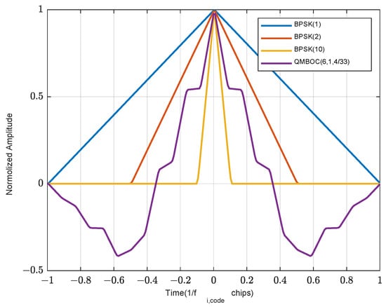 The ACFs of the BPSK(2), BPSK(10), and QMBOC(6,1,4/33) signals based on a BIC signal adopting QMBOC modulation are shown in Figure 3. The occurrence of multiple side peaks in the ACF of the QMBOC signal suggests that tracking the B1C signal will face more severe ambiguity problems than tracking the BPSK signal.