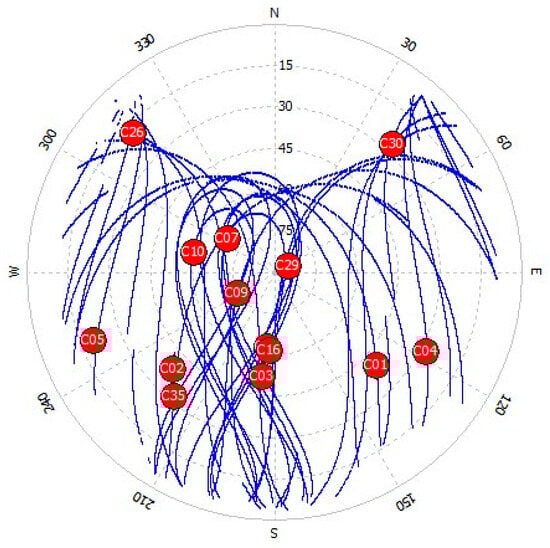 The effectiveness of this rapid high-precision ranging technique was validated using a signal simulation. Firstly, the dynamic characteristics of the satellite were simulated by calculating the position and velocity of the satellite at 16:51 on 30 July 2024, based on the satellite’s real ephemeris. Figure 4 shows the sky map of BDS satellites at that time. There are 14 visible satellites with PRN numbers of 1, 2, 3, 4, 5, 6, 7, 9, 10, 16, 26, 29, 30, and 35. The receiver coordinates in the ECEF coordinate system at this time point are (−273645.58, 5007604.80, 3219598.78). The geometric dilution of precision value is 1.7, indicating that a high-quality positioning service can be provided. The sampling rate is set to 99.375 MHz, and the IF center frequency is set to 14.58 MHz.