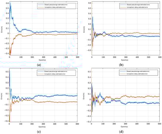 Estimation errors of the biased pseudorange and ionospheric delay on multi-frequency integrated signals: (a) six-frequency integrated; (b) five-frequency integrated; (c) quad-frequency integrated; (d) triple-frequency integrated.