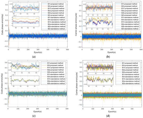 We further demonstrate that the proposed method can fully exploit the coherence of the code and carrier phases of multi-frequency signals to achieve precise ranging. In this experiment, the code and carrier phase error, which refers to the deviation between the estimated and true value, is compared with the error under conventional single-frequency-independent tracking. The frequency combination scheme for joint processing is shown in Table 2. To ensure a valid comparison, the parameters of the simulated signal and receiver are consistent with those specified in Table 3. Figure 6 shows the code and carrier phase errors of multi-frequency integrated signals. The ‘standalone method’ represents the conventional single-frequency-independent tracking method; the ‘proposed method’ represents the rapid high-precision ranging technique presented in this study. The proposed method achieves higher tracking accuracy and the stable joint tracking of multi-frequency signals. Moreover, the tracking sensitivity of each frequency is significantly improved, and the tracking error of the proposed method is significantly smaller than that under the conventional single-frequency-independent tracking method. In addition, the standard deviation (STD) of the code and carrier phase errors in Table 4 shows that the proposed method achieves an improvement in the code phase error exceeding 90% compared to that under the single-frequency-independent tracking method, as well as an improvement of over 60% in the carrier phase error. This phenomenon can be attributed to the proposed method jointly processing the multi-frequency signals and utilizing the high-precision characteristics of the carrier, significantly reducing the code tracking error. Therefore, the ranging accuracy depends on the accuracy of the carrier phase in the joint tracking loop. Table 4 illustrates that an increase in the relevant signal frequencies will decrease the carrier phase error. Here, carrier tracking accuracy was increased compared to that under the single-frequency-independent tracking method. Therefore, the proposed method can fully utilize the correlation among multi-frequency signals, resulting in higher carrier accuracy in joint processing than that achieved when using single-frequency-independent tracking. Additionally, increasing the frequency number also increases ranging accuracy under the rapid high-precision ranging technique.