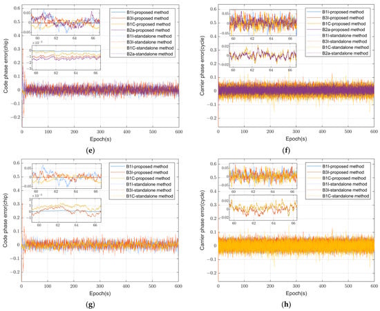 Code and carrier phase errors on multi-frequency integrated signals. (a) Code phase error using integrated six-frequency signals; (b) carrier phase error using integrated six-frequency signals; (c) code phase error using integrated five-frequency signals; (d) carrier phase error using integrated five-frequency signals; (e) code phase error using integrated quad-frequency signals; (f) carrier phase error using integrated quad-frequency signals; (g) code phase error using integrated triple-frequency signals; (h) carrier phase error using integrated triple-frequency signals.