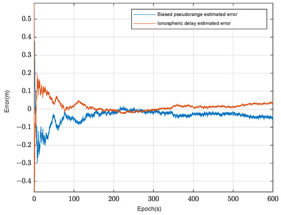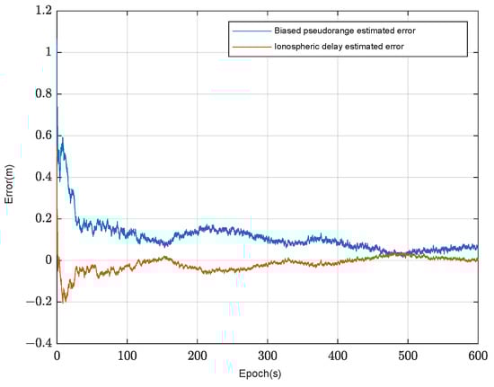 In this test, the C/N0 value of the B1I signal was attenuated to 22 dB-Hz, and the C/N0 values of the signals at other frequencies were set to 30 dB-Hz. As shown in Figure 9, the estimated biased pseudorange and ionospheric delay error were less than 0.1 m after about 1 min. Figure 10 shows that the code and carrier phase errors of the B1I signal gradually stabilized, demonstrating that this proposed method can reliably track the B1I signal. These results indicate that when multiple frequencies are jointly processed, the specific frequency does not affect the overall tracking when selective frequency signal attenuation occurs and that tracking results can actually assist in tracking signals from frequencies with poor quality.