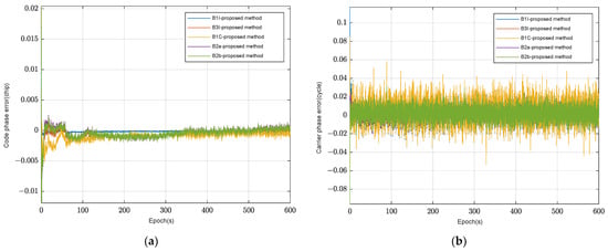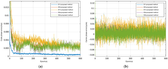 Code and carrier phases error of the five-frequency integrated signals in a weak signal environment. (a) Code phase errors of B1I, B3I, B1C, B2a, and B2b; (b) carrier phase errors of B1I, B3I, B1C, B2a, and B2b.