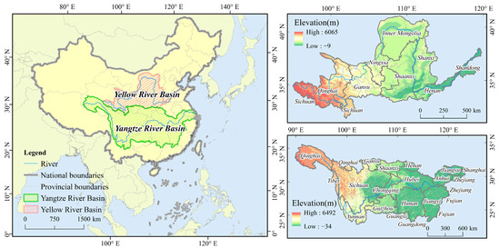 The Yangtze River and the Yellow River are regarded as the mother rivers of China (see Figure 1). They have nourished the time-honored Chinese civilization and nurtured the industrious and courageous Chinese people. The Yangtze River is China’s longest river and the world’s third longest river, spanning from 90°33′E to 122°25′E and from 24°30′N to 35°45′N. The Yangtze River basin (YTRB) accounts for 20% of China’s land area, carrying 1/3 of the population. The area is characterized by a high degree of topographic complexity and diversity, as well as a considerable range of climatic types. The diverse climate has led to the formation of a multitude of ecosystem types, which in turn have made the YTRB an important habitat for rare and endangered wildlife in China. The Yellow River basin (YLRB) is situated between 32°10′N and 41°50′N and between 95°53′E and 119°05′E. It plays an instrumental role in the national economic development pattern, encompassing 27.3% of the country’s area, serving as a domicile for 23.3% of the country’s population, and contributing 21.8% of the total economic output. The terrain is low in the east and high in the west, with varied regional topographies and diverse climates, making the area a significant ecological barrier and economic zone in China. The accelerated urbanization in the YYRBs has intensified the deterioration of the eco-environment. The urbanization process has an obvious coercive effect on the EEQ, while the EEQ also has an obvious constraint effect on the urbanization process. This two-way interaction and coercive relationship is particularly prominent in the YYRBs. This requires that we attach great importance to the protection and restoration of the eco-environment while promoting urbanization in order to achieve the sustainable development of the two big basins.