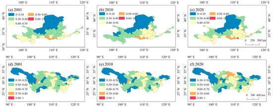 Spatiotemporal patterns of EEQ in the YYRBs in 2001, 2010, and 2020. Note: (a–c) represent the spatiotemporal patterns of EEQ in the YLRB in 2001, 2010, and 2020, respectively; (d–f) represent the spatiotemporal patterns of EEQ in the YTRB in 2001, 2010, and 2020, respectively.