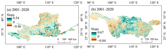 Changing trend in EEQ in the YYRBs during the period of 2001–2020. Note: The slope of the linear regression equation is considered to be the annual variation rate of the EEQ. (a) indicates the trend of EEQ in the YLRB from 2001 to 2020, and (b) indicates the trend of EEQ in the YTRB from 2001 to 2020.