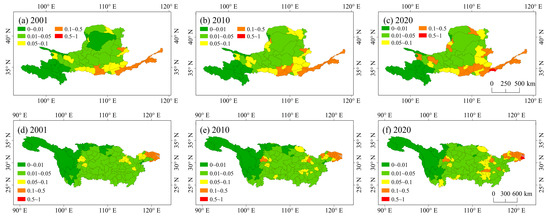 The UL in the YLRB exhibited a spatial distribution pattern of high in the east and low in the west (see Figure 4), and the overall UL in the lower reaches was significantly higher than that observed in the middle and upper reaches. The average UL values of the YLRB were 0.06, 0.08, and 0.10 in 2001, 2020, and 2020, respectively. This demonstrated an overall increasing trend, with an average increase of 66.67% over the period under review. In particular, the UL increased in northwestern Gansu, southern Shaanxi, and southern Shanxi. Specifically, Qinghai and Sichuan, in the upper reaches, demonstrated a consistently low UL. The middle reaches exhibited rapid growth and significant increases, though the overall UL remained relatively low. The lower reaches maintained a relatively high UL, with minimal changes during the study period. Overall, areas with high UL were clustered in regions such as Zhengzhou, Xi’an, Jiaozuo, and Taiyuan.